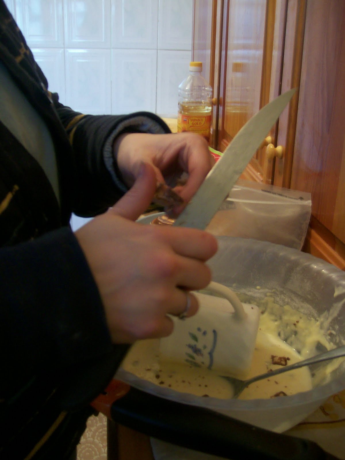 Chef Enkhuush decided we should have toast with our eggs so I started cutting the bread into slices. Recently when we purchased a new oven, we purchased new knives too--and they were sharp--and I sliced my finger. This is Enkhuush's "Come on! Haven't you ever cut anything before?!" face.
